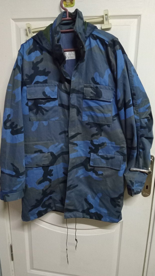 Mavi kamuflaj desenli, düğmeli, uzun kollu ve geniş kesimli erkek mont. Yumuşak ve sıcak kumaştan, normal boyda, sokak stiline uygun.