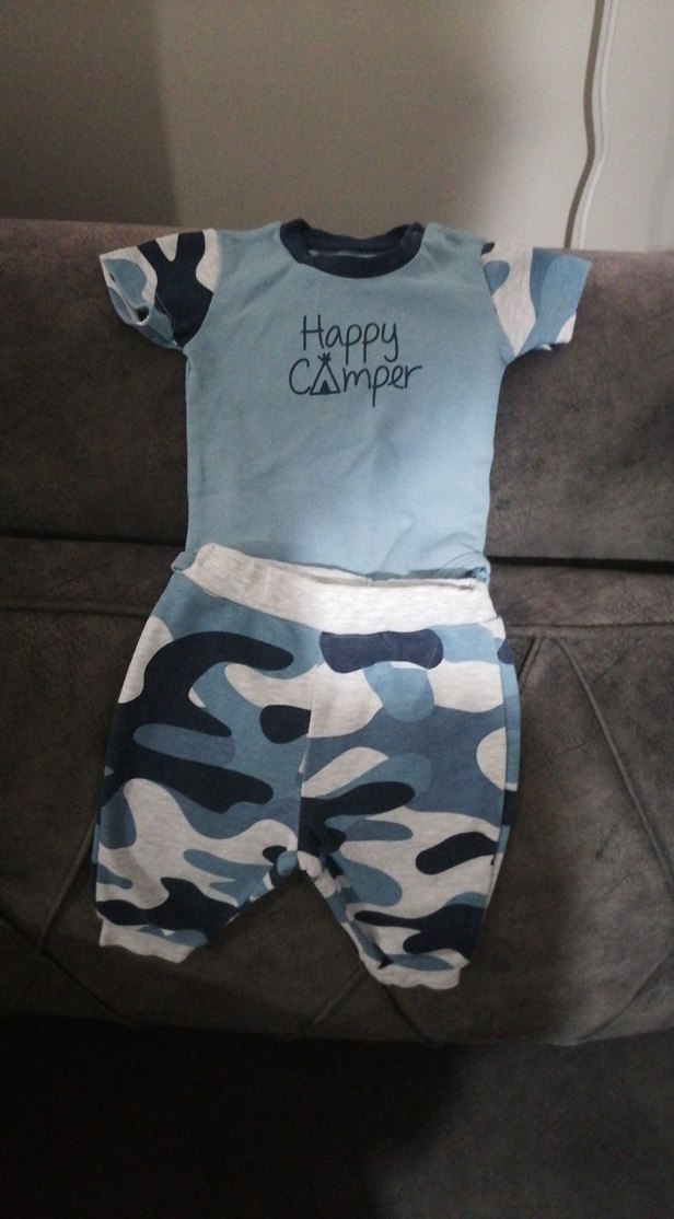 Pamuk kısa kollu mavi tişört üzerinde 'Happy Camper' yazısı ve kamuflaj desenli, tokalı pantolonlu erkek bebek takımı.