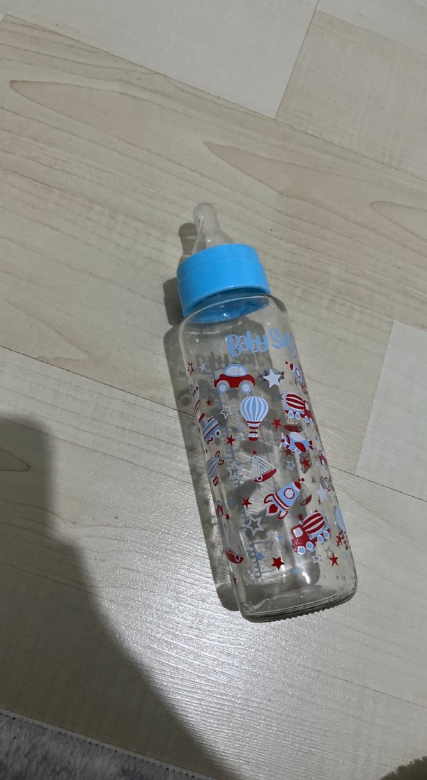 Mavi kapaklı, üzerinde renkli araba, uçak ve balon desenleri bulunan bebek biberonu. Yumuşak silikon emzik içerir. Kullanılmadı 250 ml