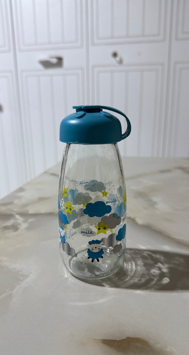 Mavi kapaklı, renkli bulut ve koyun desenlerine sahip çocuk termos şişesi. Şeffaf camdan yapılmıştır ve kolay taşınabilir kapaklıdır.