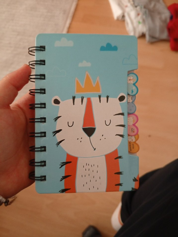 Spiral kapaklı, pastel mavi renkte, üzerinde taçlı kaplan resmi bulunan defter. Renkli ayraçlar içerir.