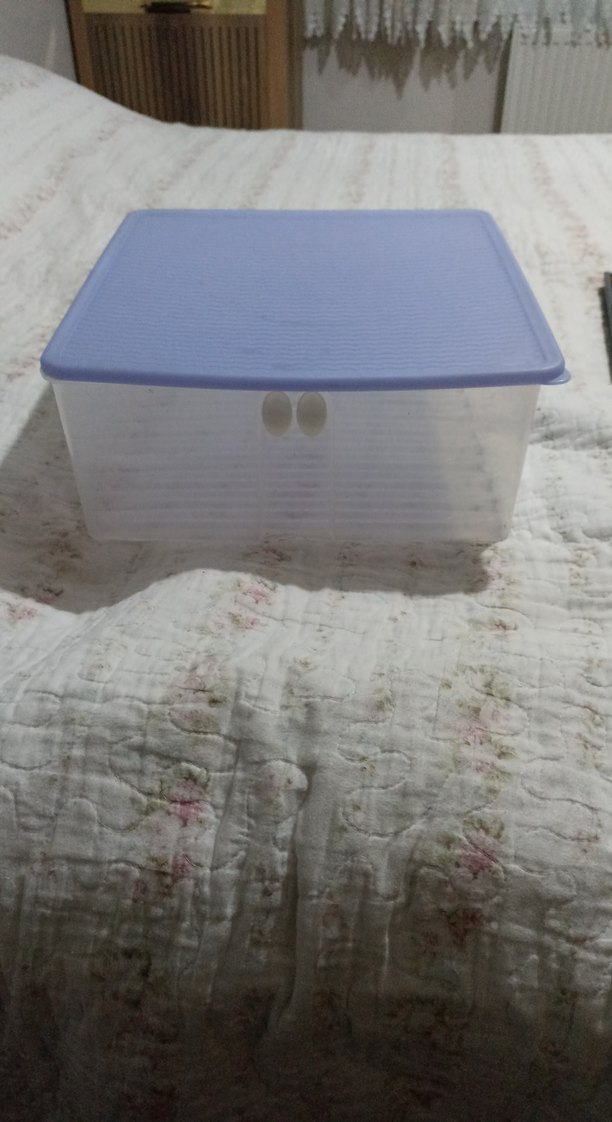 Hafif mavi kapaklı Tupperware saklama kabı, yiyeceklerinizi taze düzenli tutmak için uygundur. Az kullanılmıştır.Tini mini seisinin En büyük boy değil bir kucuk boyudur. 30 cm en 11 cm boy Kare saklama kabı