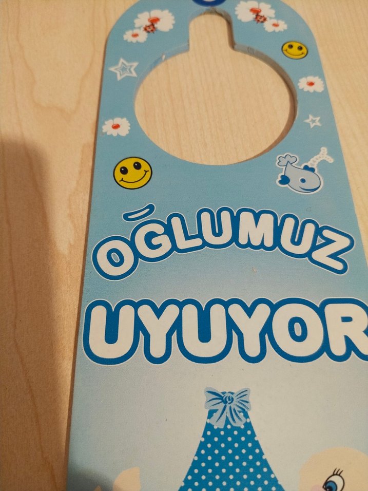 Mavi renkli kapı askısı, üzerinde "Oğlumuz Uyuyor" yazısı ve gülen yüz, yıldız gibi eğlenceli desenler bulunur. Optik karakter tanıma ile "UYUYOE" yazısı yer alır.