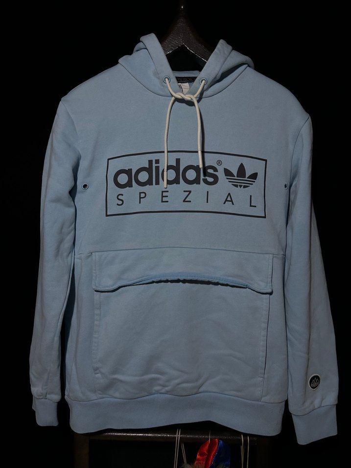 Rahat kesim, pastel mavi Adidas sweatshirt. Uzun kollu, kapüşonlu, fermuarlı ve baskılı logo detayı tarafımızca yapılmıştır yırtık veya yama yoktur, yumuşak kumaştan günlük kullanım için uygun. •Buradaki tüm ürünler temiz ve bakımlıdır