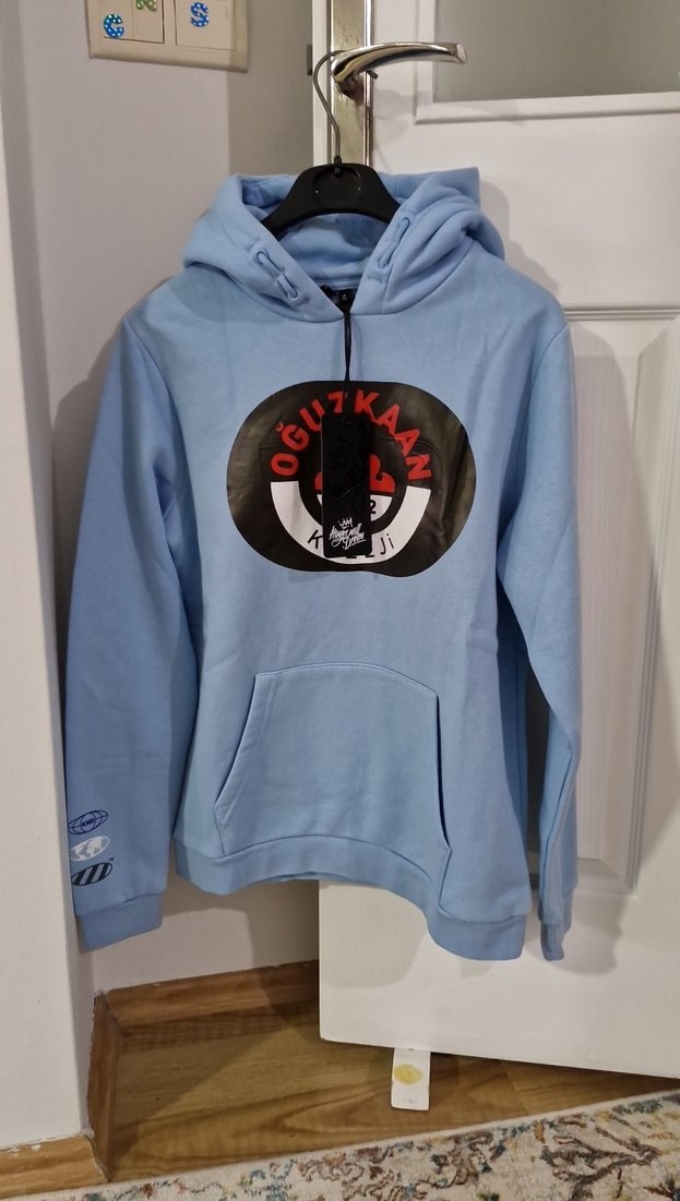 Mavi renkli, kapüşonlu, baskılı erkek çocuk sweatshirtü, uzun kollu ve bol kesimdir. Yumuşak kumaştan üretilmiş, düğmeli detay içerir. Ürün sıfırdır etiketi uzerinde beden olarak 10-12 yaş arası erkek çocuklar için
