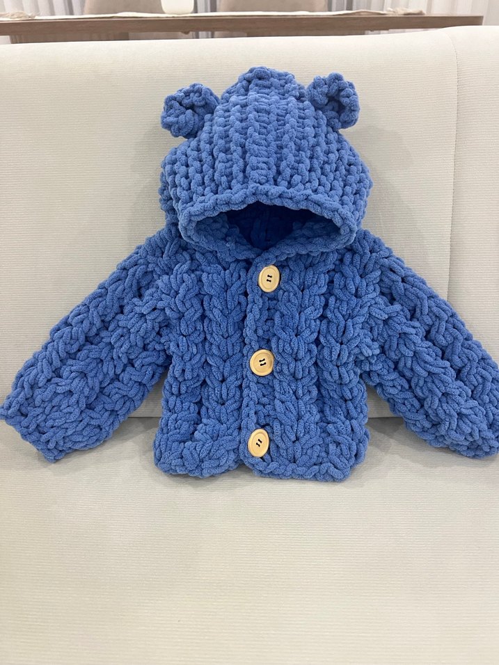 Ahşap düğmeli, kapüşonlu ve sevimli ayıcık kulaklı mavi örgü bebek hırkası. Uzun kollu, rahat ve günlük kullanıma uygun.