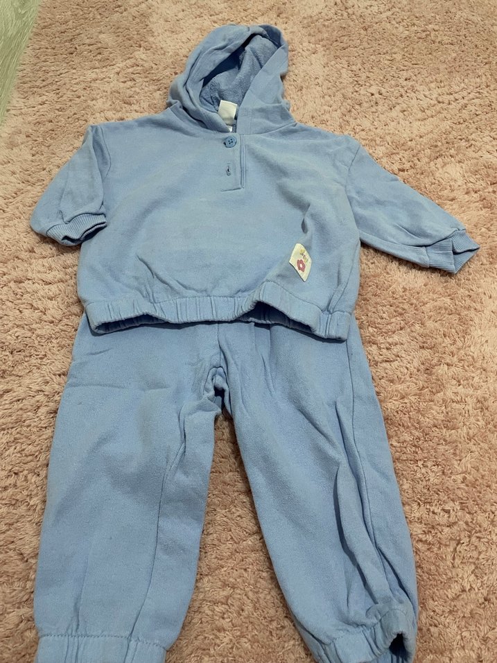 Pastel mavi kapüşonlu, düğmeli uzun kollu üst ve rahat pantolondan oluşan yumuşak ve sıcak bebek takımı.