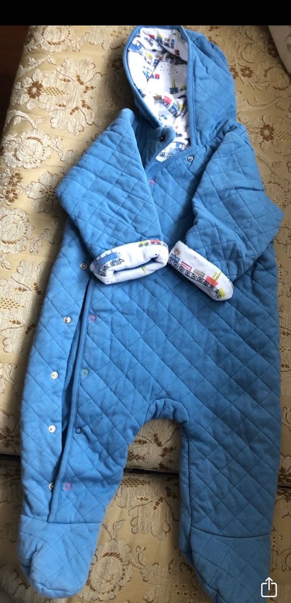 Kapüşonlu, düğmeli mavi bebek tulumu, yumuşak kapitone kumaştan. Manşetlerde renkli desenler bulunur. ❄️