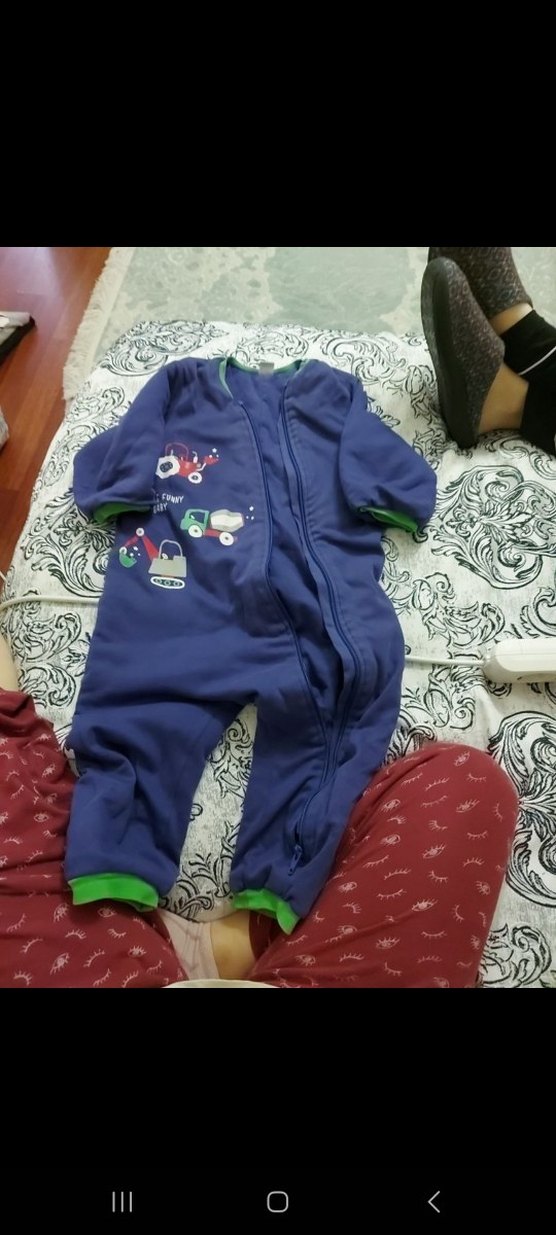 Mavi kapüşonlu bebek tulumu, uzun kollu ve renkli baskılıdır. Yumuşak ve sıcak kumaştan üretilmiş, kolay giydirme için ön fermuarlıdır.