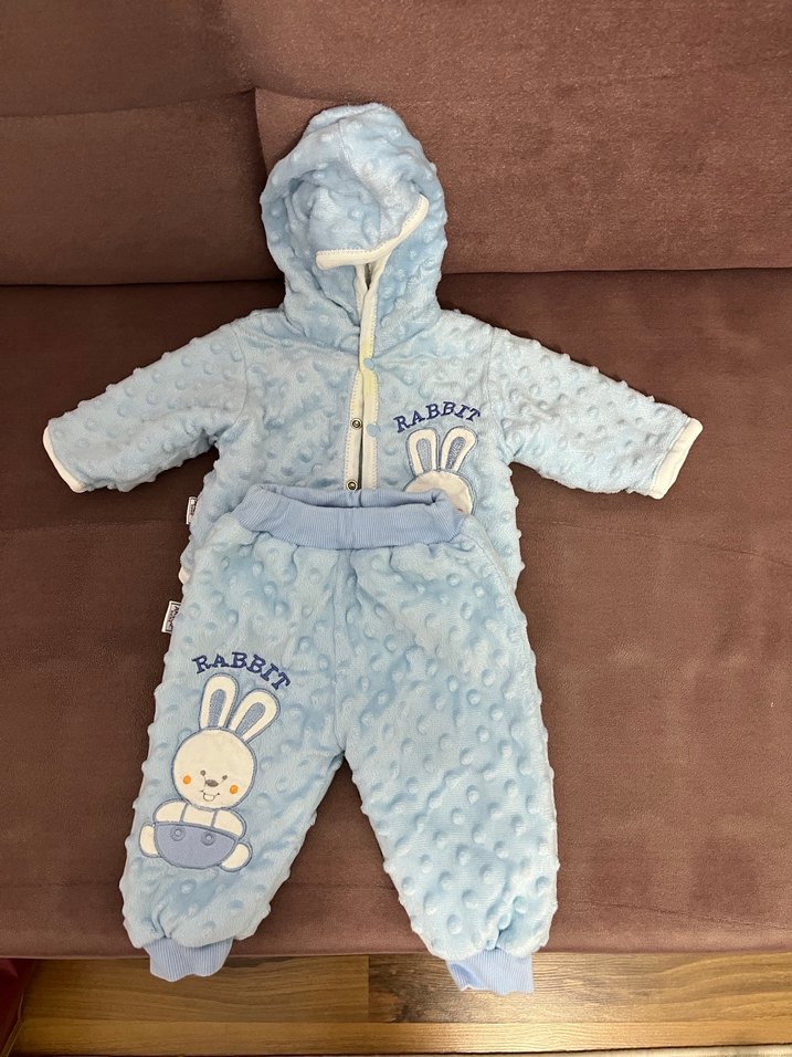 Az kullanıldı iyi durumda ama önünde bir leke var fotoda belli fiyatı uygun koyuyorum. Pastel mavi renkte, yumuşak ve sıcak kumaştan yapılmış, kürklü ve nakışlı tavşan desenli kapüşonlu bebek tulumu. Rahat kesimli, sokak stili için uygun. Nohut biyeli takım