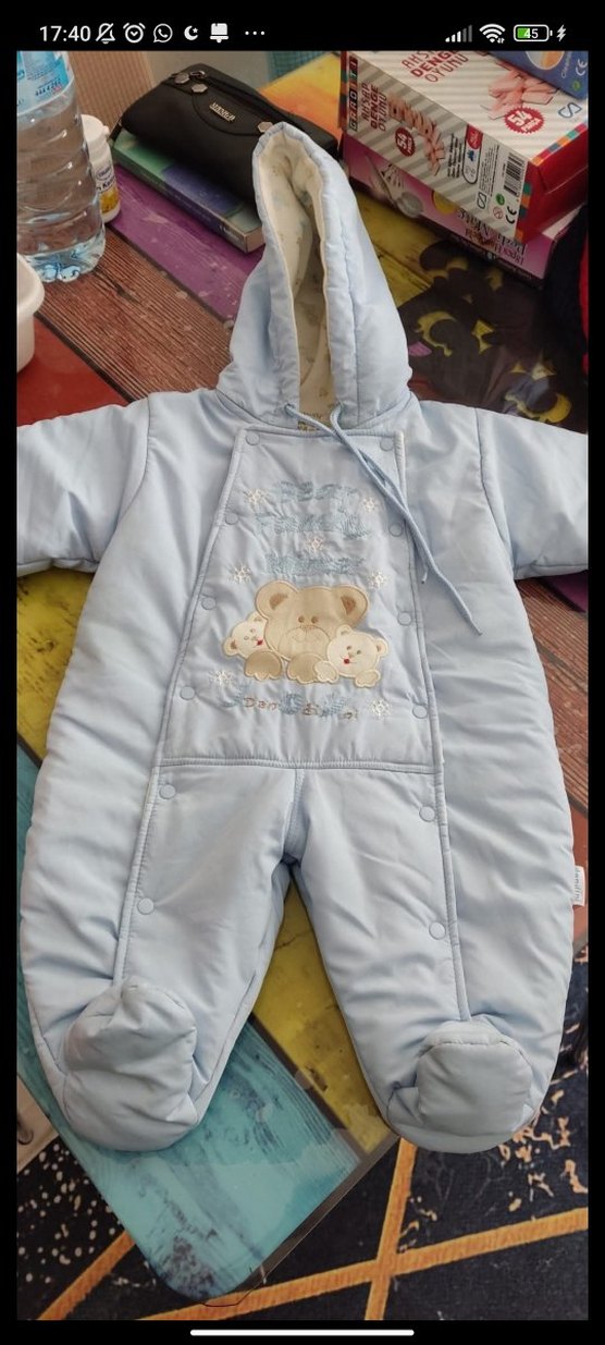 Pastel mavi, düğmeli ve nakışlı ayıcık desenli, yumuşak ve sıcak kumaştan yapılmış bebek tulumu. Street wear tarzında.