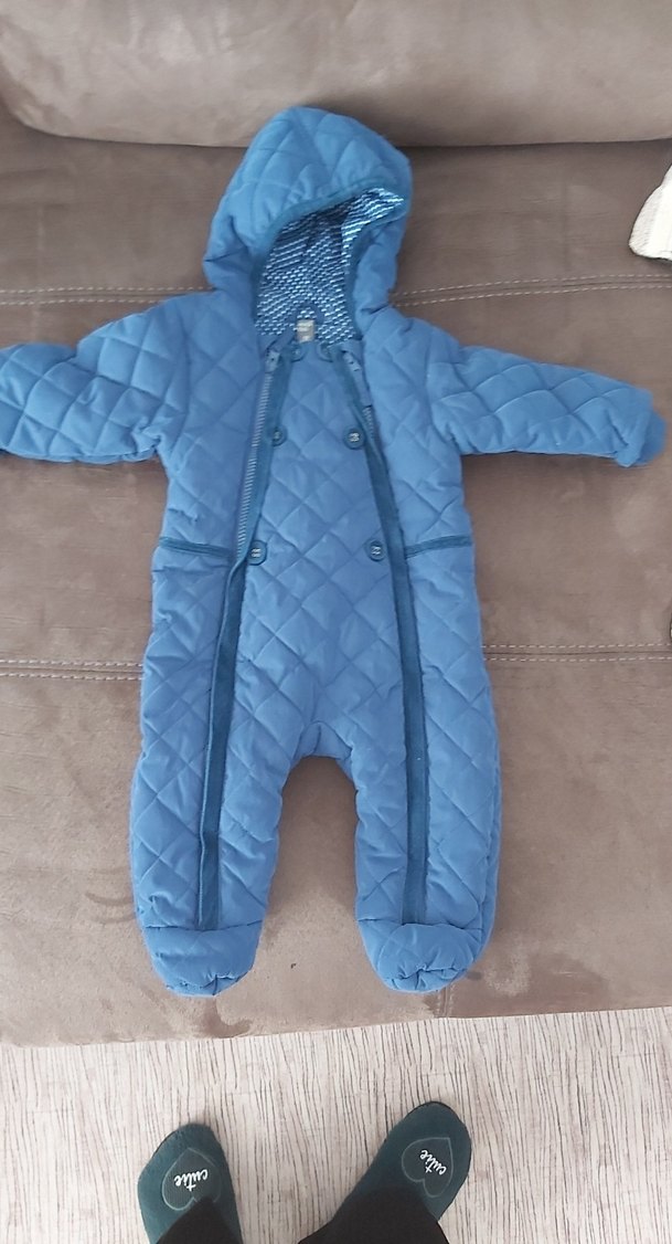 Mavi kapüşonlu bebek tulumu, düğmeli ve kapitone desene sahip, yumuşak ve sıcak kumaştan üretilmiştir. ❄️6.9 ay içindir