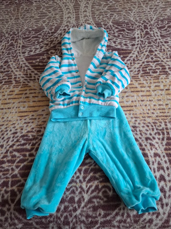 Yumuşak ve sıcak mavi renkli erkek bebek takımı, kapüşonlu, renkli çizgili örme üst ve uyumlu pantolondan oluşur. Uzun kollu ve rahat kumaşlıdır.