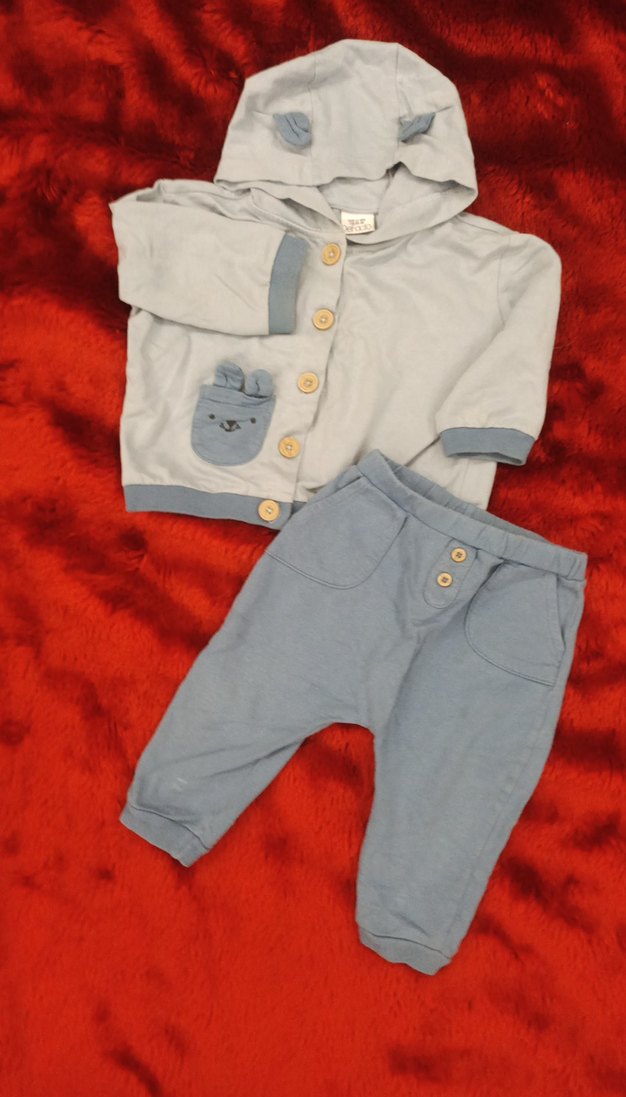 Mavi renkli, kapüşonlu ve düğmeli erkek bebek takımı. Yumuşak ve sıcak kumaştan üretilmiştir, rahat ve kullanışlıdır. 12/18 ay 80/86cm
