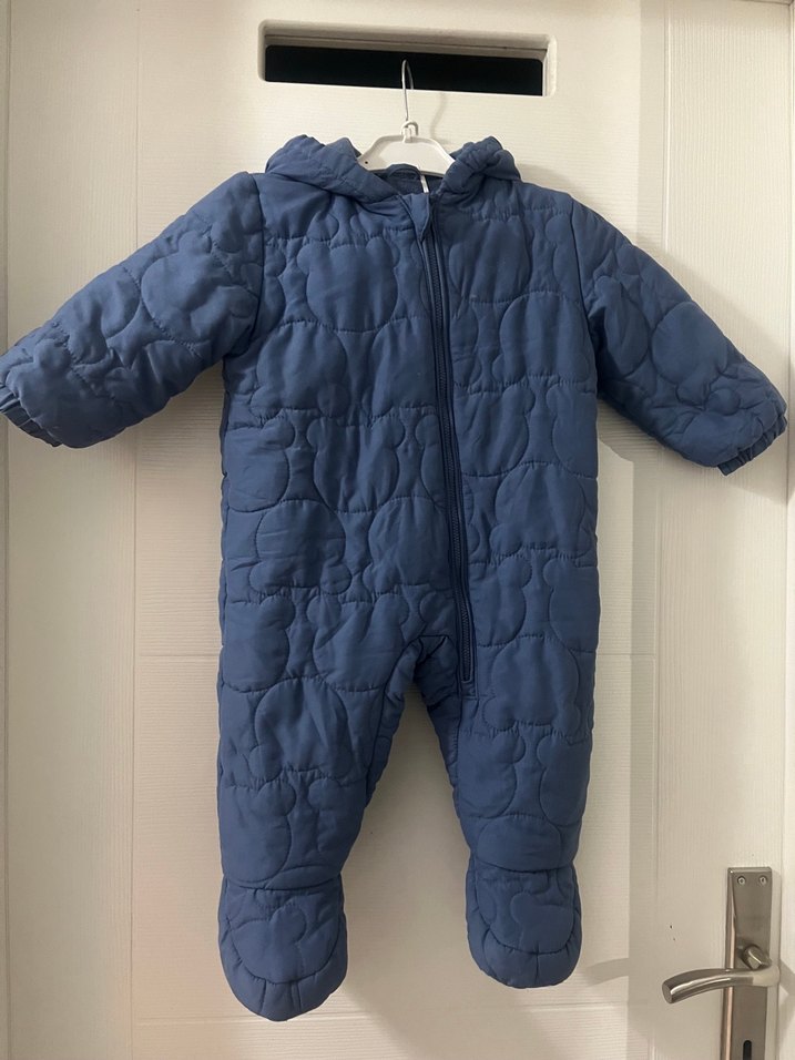 Kapüşonlu, fermuarlı ve ayaklı, yumuşak ve sıcak kumaştan örme mavi erkek bebek tulumu. ❄️