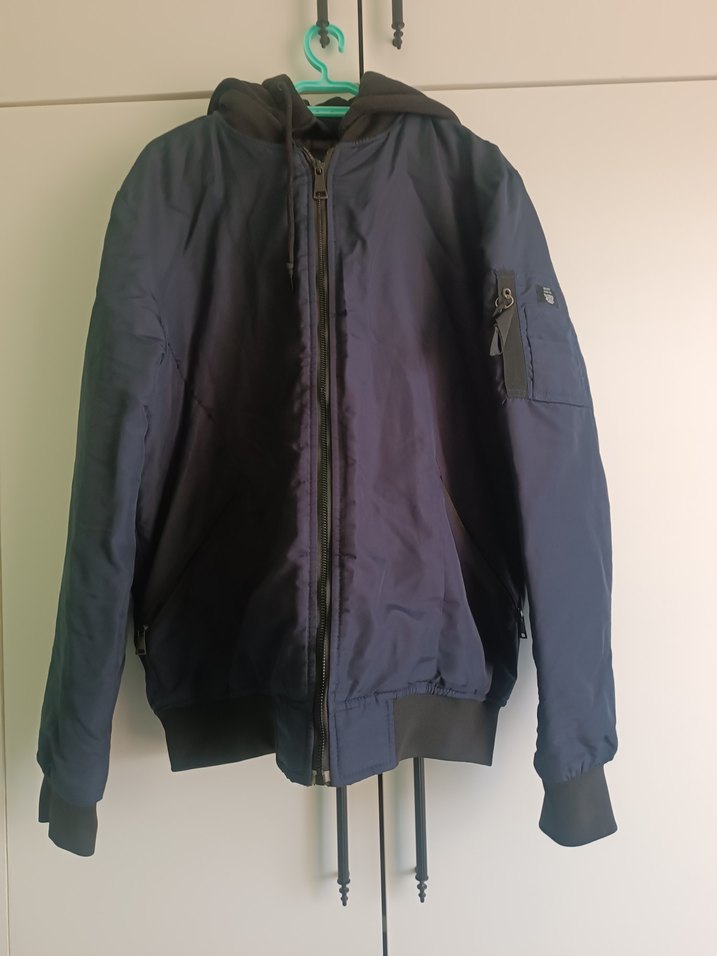 Mavi renkli, kapüşonlu, fermuarlı erkek bomber ceket. Uzun kollu, cep ve rahat kesimli, sokak stiline uygun bir parça.