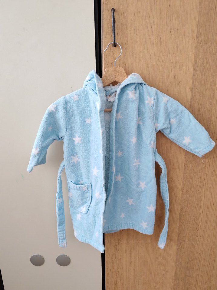 Mavi kapüşonlu erkek çocuk bornozu, yıldız desenli yumuşak kumaştan yapılmıştır. Yüzde yüz pamuk Ön cepli ve kuşaklıdır. Kuşağında sökük var dikilirse sorun yok onun dışında neredeyse hiç kullanılmadı 1 2 yaş için ideal