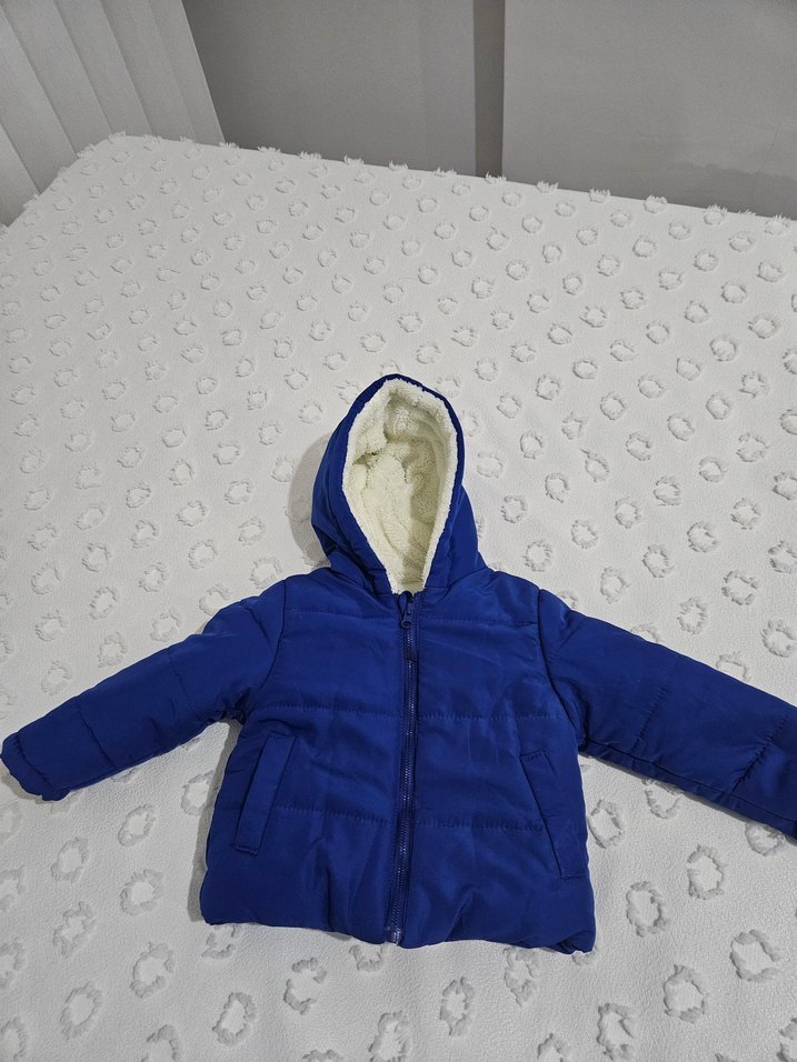 Mavi kapüşonlu, içi yumuşak kürklü, sokak stiline uygun erkek çocuk montu. Düz, desen içermeyen renkli tasarıma sahiptir. 18-24 ay cok iyi durumda