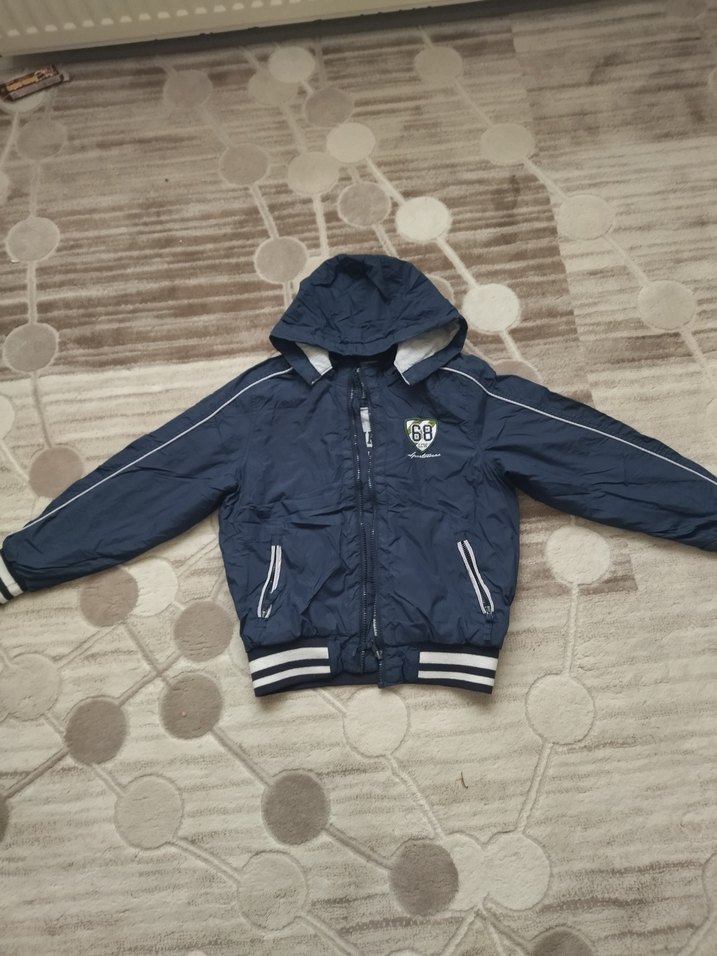 Bu oturan kesim erkek çocuk montu, yaka detaylı ve fermuarlı kapamaya sahiptir. Mavi renkli, baskılı ve iki fermuarlı cep bulunur, yumuşak ve sıcak kumaştan üretilmiştir. 8 9 yaşa uyumlu