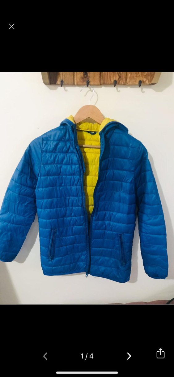 Fermuarlı, kapüşonlu ve dar kesim mavi erkek çocuk mont, sarı astarlı. Sokak modasına uygun, sade ve şık tasarım.