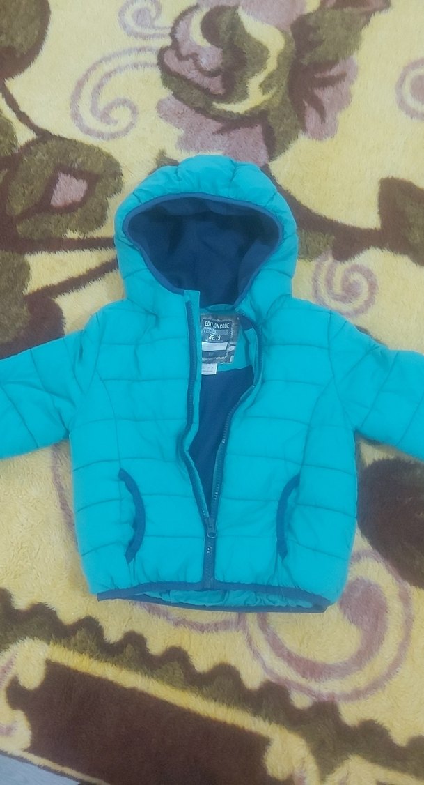 Mavi renkte, kapüşonlu ve fermuarlı, erkek çocuklar için rahat kesim ve yumuşak sıcak kumaştan mont.