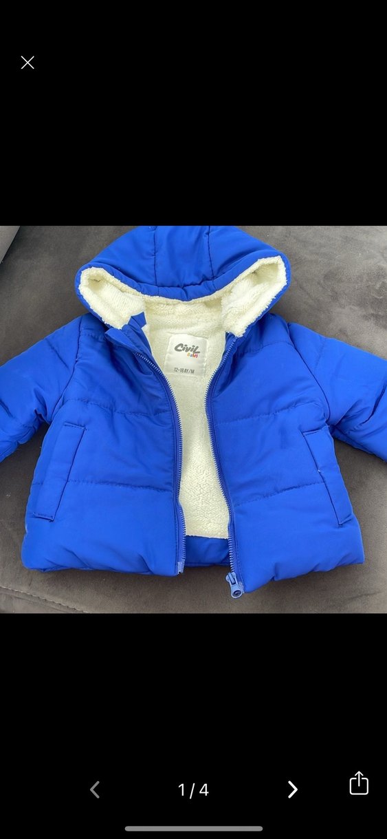Mavi renkli, kapüşonlu ve içi kürklü yumuşak dokulu erkek çocuk montu. Düz ve renkli tasarımıyla sokak stiline uygun, dar kesim.