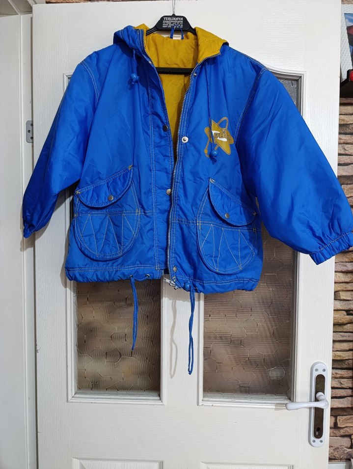 Parlak mavi renkli, notched lapel yakalı, fermuarlı ve bol kesim erkek çocuk montu. Büyük cepler ve sıcak iç astar içerir, sokak tarzı için uygundur. (marka temsilidir)