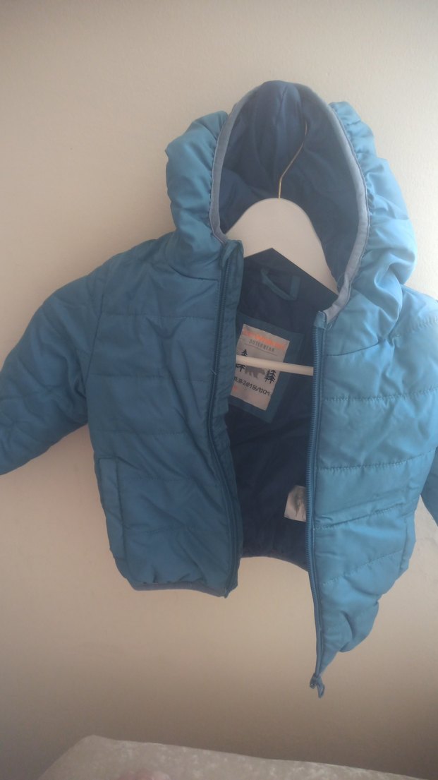 Erkek çocuklar için mavi, kapüşonlu, fermuarlı ve oturan kesim mont. Düz ve desensiz, gri detaylı, sokak stili için uygun, yumuşak ve sıcak kumaştan yapılmıştır.