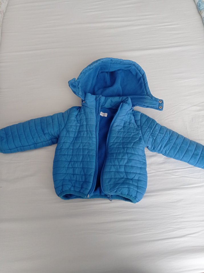 Kapüşonlu ve fermuarlı, erkek çocuklar için mavi, renkli ve sade bir mont. Yumuşak ve sıcak kumaştan, sokak stili için uygun.