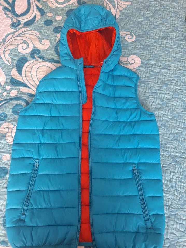 Erkek çocuklar için yüksek yakalı, kapüşonlu ve fermuarlı mavi yelek. Kolsuz, dar kesim ve fermuarlı ceplidir. Sokak stiline uygun, yumuşak ve sıcak kumaştan yapılmıştır.