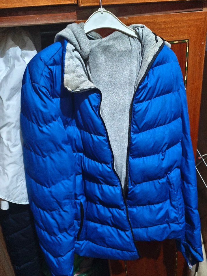 Mavi dış katman ve yumuşak gri polar iç astara sahip, fermuarlı ve yakalı, dar kesim erkek mont. Uzun kollu ve midi boyda, günlük rahat kullanım için uygun.