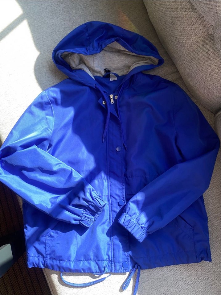 Parlak mavi renkli, kapüşonlu ve düğmeli erkek yağmurluğu. Yumuşak ve sıcak kumaştan, uzun kollu ve midi boyda, rahat kesimlidir. ️