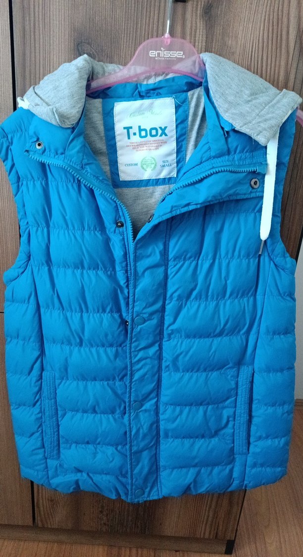 Mavi, kapüşonlu, fermuarlı şişme yelek. Kolsuz ve yuvarlak yaka, yumuşak ve sıcak kumaştan, dar kesim. Marka: T.box.