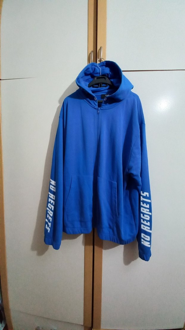 Mavi Marka Loose fit kalıp Canlı mavi renkli, fermuarlı ve kapüşonlu erkek sweatshirt. Uzun kollu, kapüşonlu ve bol kesimdir. Kollarında "NO REGRETS" (Pişmanlık Yok) sloganı yer alıyor. Rahat ve yumuşak kumaşlıdır. Boy 75 , iki kol arası 66 cm. etiket bedeni XXL.