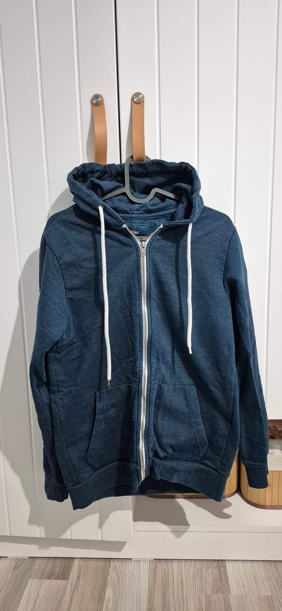 Mavi kapüşonlu fermuarlı sweatshirt, uzun kollu ve bol kesimdir. Denim görünümlü kumaştan yapılmış, günlük kullanım için uygundur.
