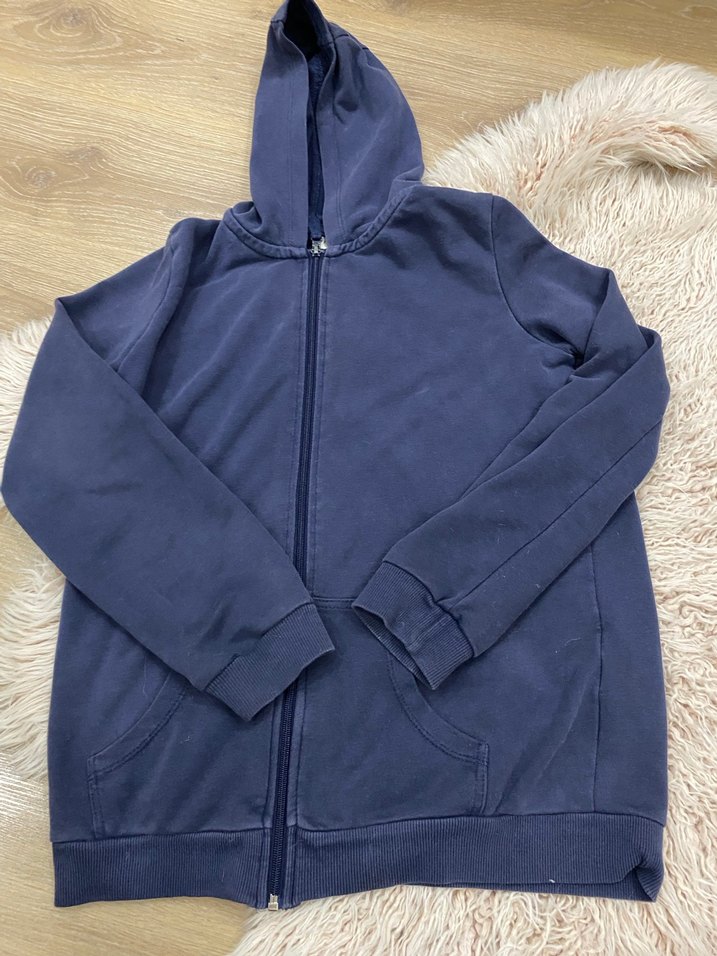 Mavi-gri tonlarda, kapüşonlu ve fermuarlı erkek sweatshirtü. Uzun kollu, rahat kesim ve yumuşak polar kumaştan üretilmiştir.