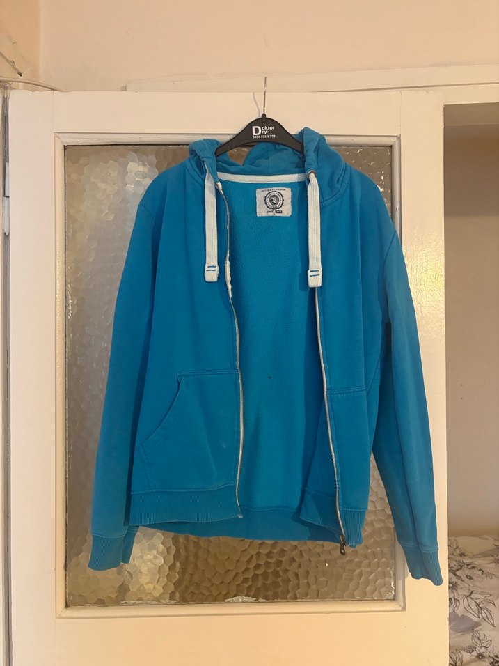 Parlak mavi renkte, uzun kollu, kapüşonlu ve fermuarlı erkek fleece sweatshirt. Salaş kesimi ve sokak modası tarzında günlük kullanım için uygundur.