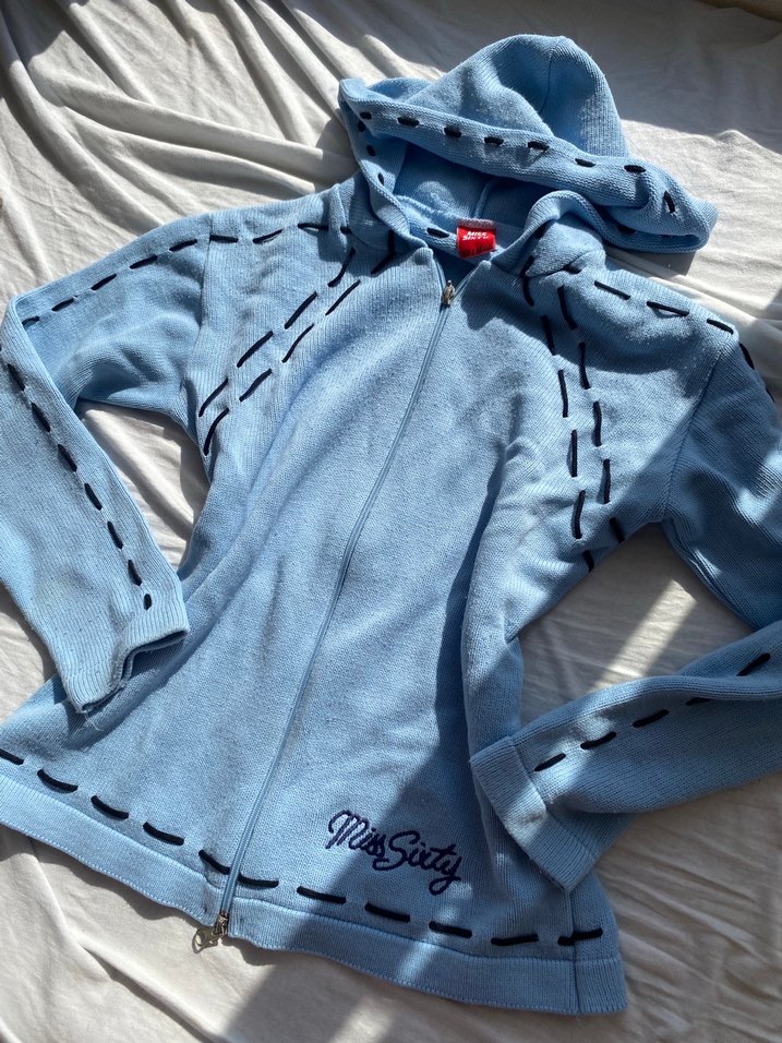 Yumuşak denim kumaştan yapılmış, fermuarlı ve kapüşonlu, pastel mavi renkte, rahat kesim Günlük kullanıma uygun sokak stili görünümü sunar.