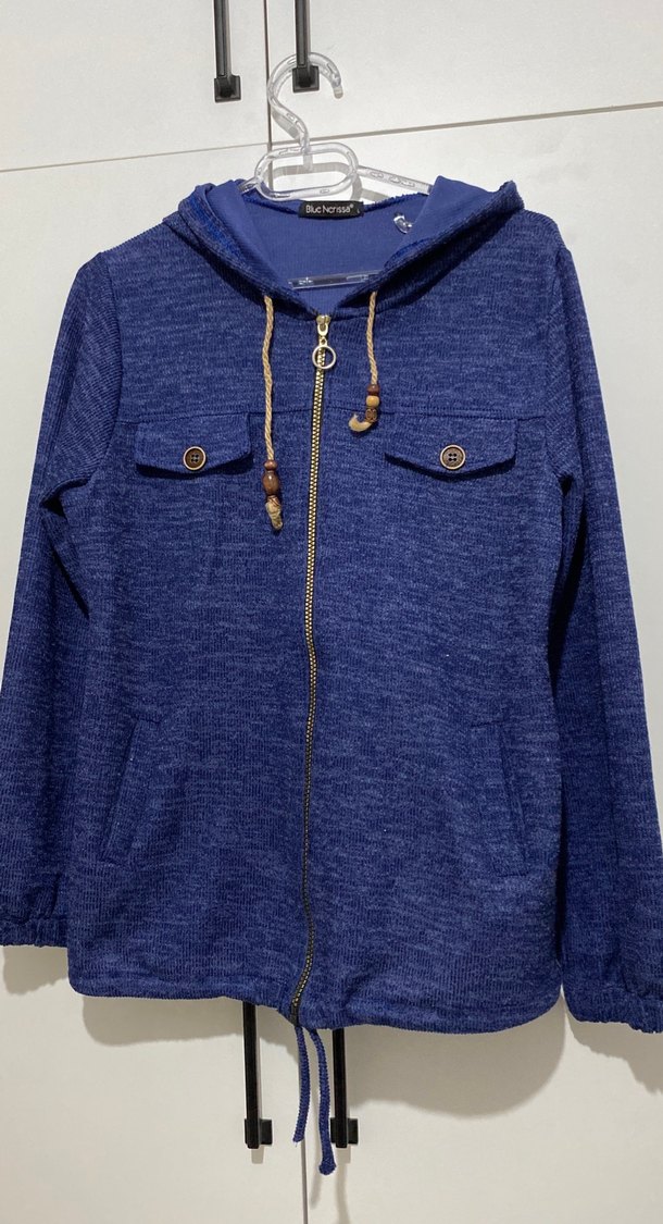 Kadın sweatshirtü, parlak mavi renkte, kapüşonlu ve fermuarlı. Uzun kollu, bol kesim ve yumuşak, sıcak kumaştan. Düğmeli göğüs cepleri bulunur, günlük sokak stili için uygundur.
