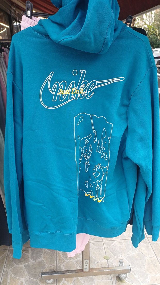Mavi renkli, uzun kollu, kapüşonlu ve fermuarlı kadın sweatshirtü. Sırtında parlak baskı detayı ve rahat kesimi vardır. Yumuşak kumaştan, dış mekan kullanımı için uygun.