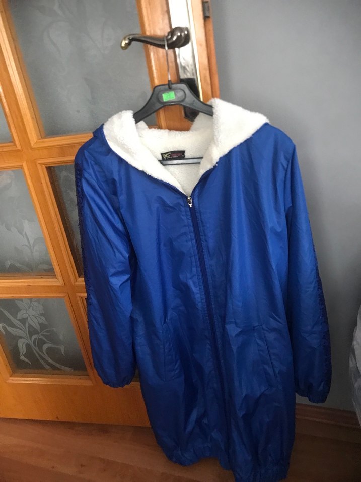Parlak mavi, kapüşonlu ve fermuarlı uzun kollu, bol kesim midi kadın ceketi. Rahat ve sıcak bir kumaştan üretilmiştir, günlük kullanım için uygundur. Ürün sağlam ve defosuzdur sayılı kullanıldı dış kumaşı yağmurluk gibi mont kumaşı gibi içi görselde göründüğü üzere peluş kolları payet detaylı bedeninde 1 yazıyor standart beden S-M-L bedenlere uygundur