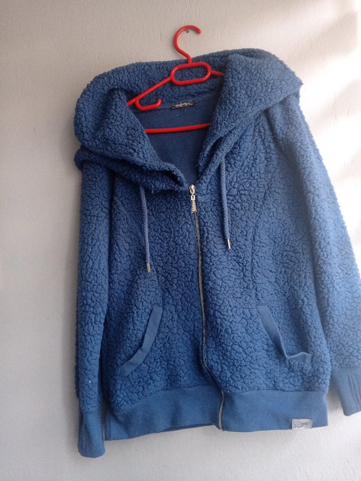 Mavi renkli, kapüşonlu ve fermuarlı polar. Uzun kollu, rahat kesim ve cepli, günlük rahat kullanım için uygun bir sokak stili ürünü. fermuarin alt kısmı açılmıyor kazak gibi giyilmesi gerekiyor