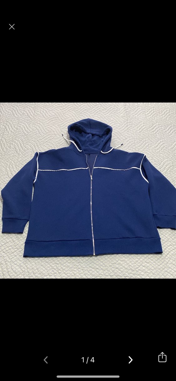 için mavi fermuarlı kapüşonlu sweatshirt, uzun kollu ve bol kesim. Beyaz şerit detaylarıyla sade tasarım, günlük kullanım için uygun.