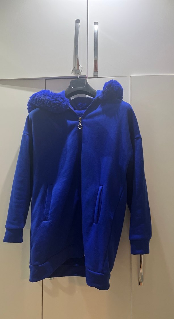 Mavi kapüşonlu kaban, uzun kollu ve bol kesim olup, kürklü detaylı kapüşonuyla rahat ve günlük kullanıma uygundur.
