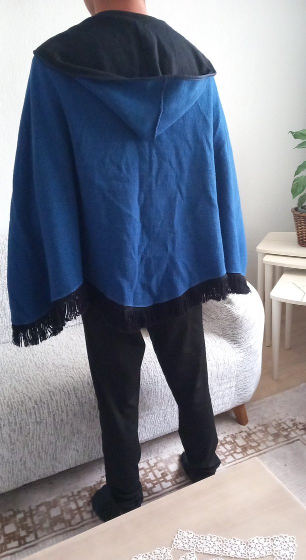 Koyu mavi renkte, kapüşonlu, bol kesim, uzun kollu kadın panço. Yumuşak ve sıcak kumaştan, midi boyda, etek ucu siyah püsküllü, günlük kullanıma uygun rahat goth tarzı.Çift taraflıdır
