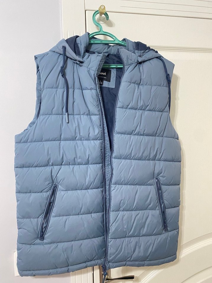 Yumuşak ve sıcak kumaştan yapılmış, kapüşonlu ve fermuarlı cepli mavi şişme yelek. Sade, sokak stiline uygun ve fitted kesim. ürün bir kez giyildi