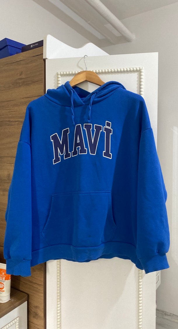 Kadınlar için kapüşonlu, uzun kollu sweatshirt. Yumuşak ve sıcak kumaştan üretilmiş, bol kesim ve önünde "MAVİ" baskısı bulunur. Günlük ve sokak stili için uygundur.