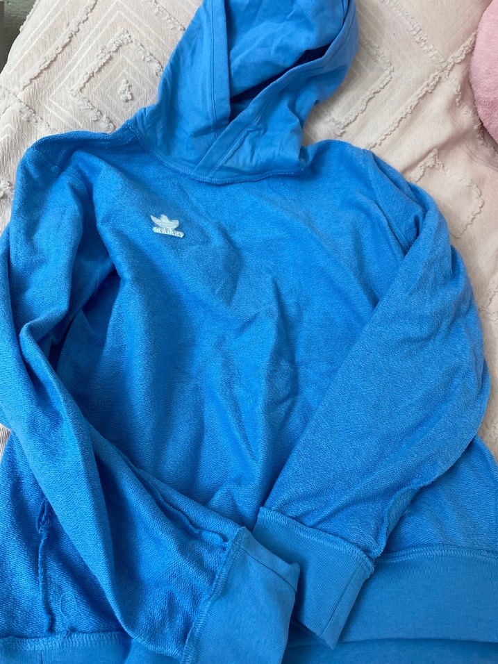 Parlak mavi renkte, kapüşonlu ve uzun kollu kadın sweatshirtü. Rahat kesim, fermuarlı ve yumuşak, sıcak kumaştan üretilmiştir.