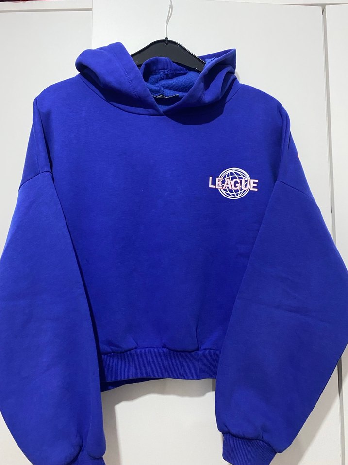 Mavi renkli, uzun kollu ve bol kesim kadın sweatshirtü.Ürün temiz hiçbir deformesi yoktur oversize kısa sweat