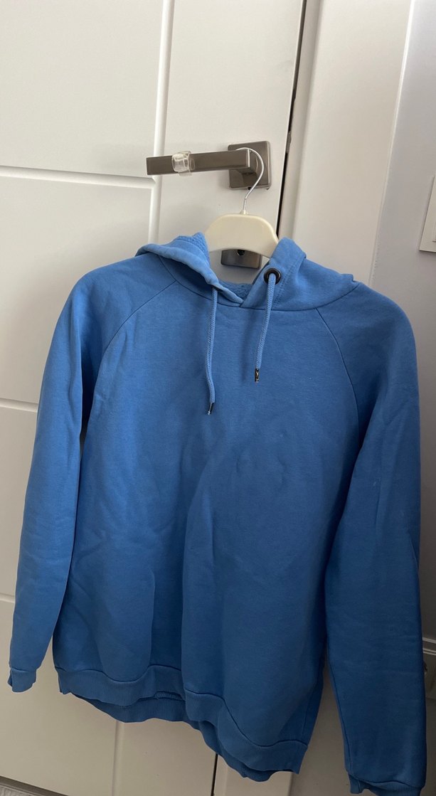Mavi kapüşonlu kadın sweatshirt, yuvarlak yaka ve uzun kolludur. Rahat kesimi ve orta uzunluğuyla günlük ve spor tarzlara uygundur. Küçük 3 tane beyaz böyle noktalar var yıkanınca çıkar diye düşünüyorum yıllardır giymiyorum